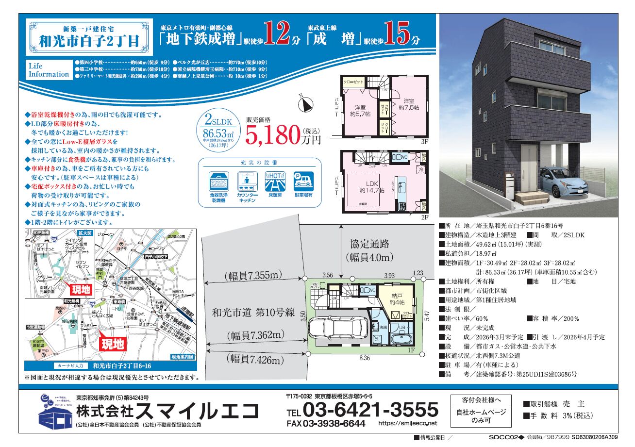 1F : 30.49㎡ 2F : 28.02㎡ 3F : 28.02㎡計 : 86.53㎡(26.17坪)(車庫面積10.55㎡含む)